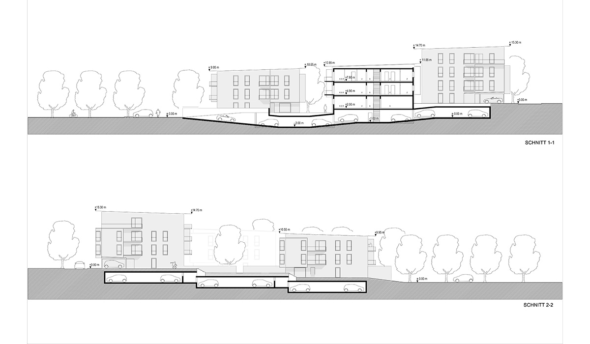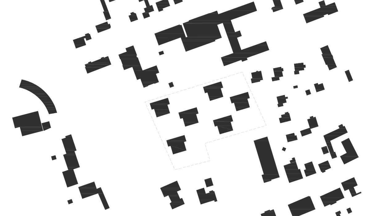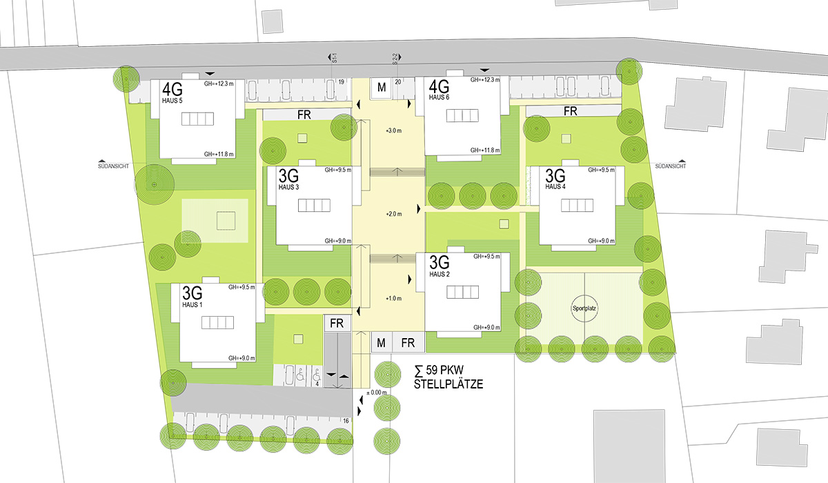 Ein kompakter Punkthaustyp besetzt das Grundstück so, dass jedem Haus Ausblicke und Besonnung gewährleistet wird. Zwischen den Objekten werden großzügige Freiflächen für Privatgärten, Spiel- und Sportaktivitäten zu Verfügung gestellt. Durch die Neigung des Hangs gelingt die Gliederung der Außenflächen in 3 Niveaus die miteinander durch eine Rampe und Sitzstufen verbunden sind. Vom jeweiligen Niveau werden ein Haus im Osten und Westen vom zentralen Platz aus erschlossen.