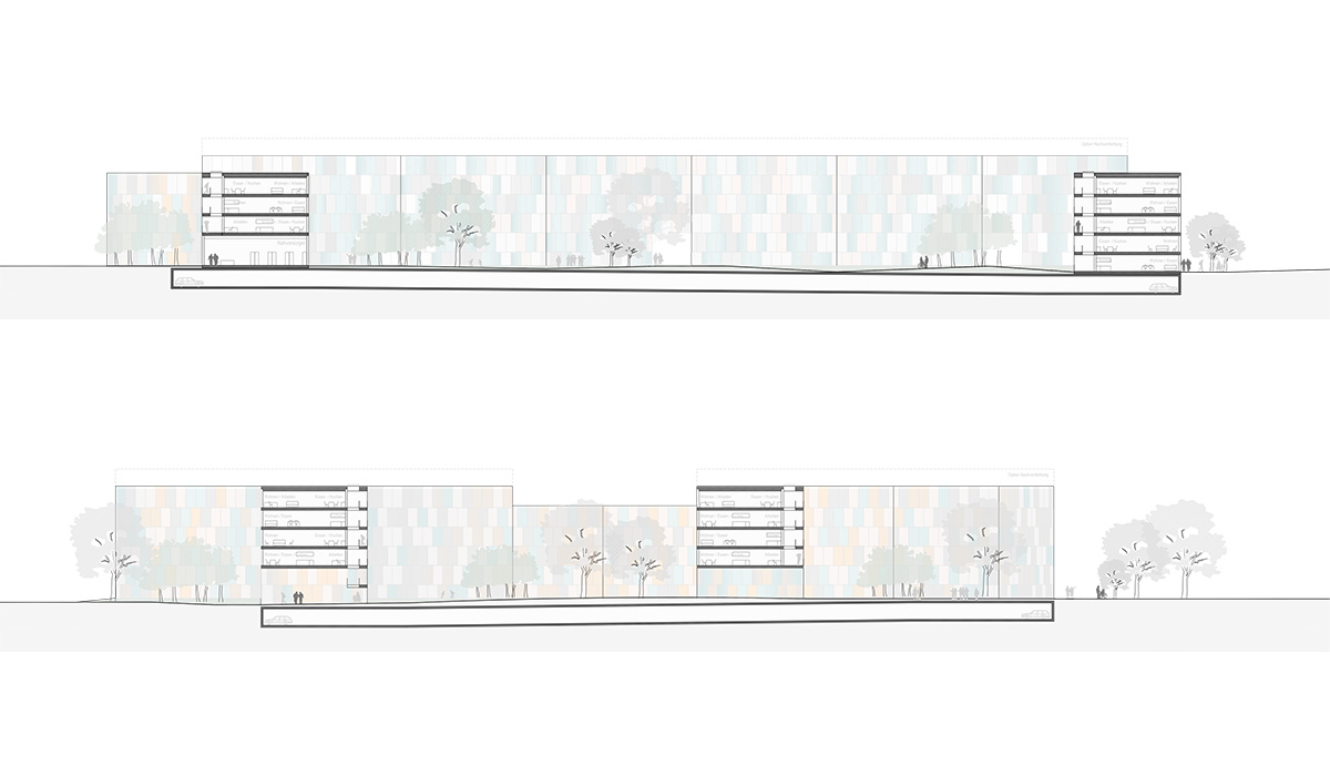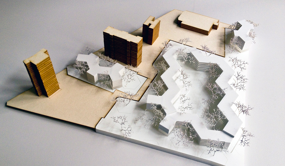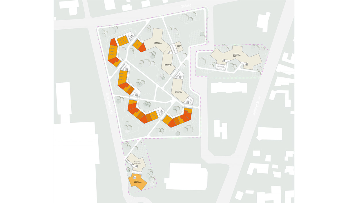 Die Teilgebiete A, B und C werden nicht getrennt voneinander bearbeitet, sondern durch ein gemeinsames Gestaltungskonzept verbunden. Das Hexagon steht hier für eine maximale Dichte bei optimal belichteten und belüfteten Lebensräumen. Die differenzierte Gestaltung ermöglicht eine Orientierbarkeit und Zuordnung der verschiedenen Wohnbereiche. Gleichzeitig bleibt die Struktur jedoch absolut ressourcenschonend in der Errichtung.